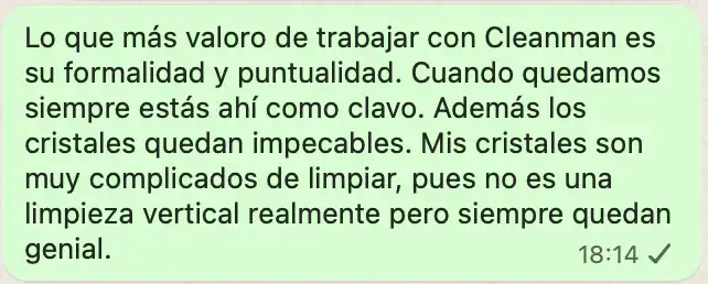 Porque en limpieza de cristales, lo barato suele salir caro: marcas, rayaduras, restos de agua en el suelo o trabajo poco duradero. Con CleanMan obtienes técnicos especializados, agua osmotizada y limpieza segura hasta 14 metros de altura.
